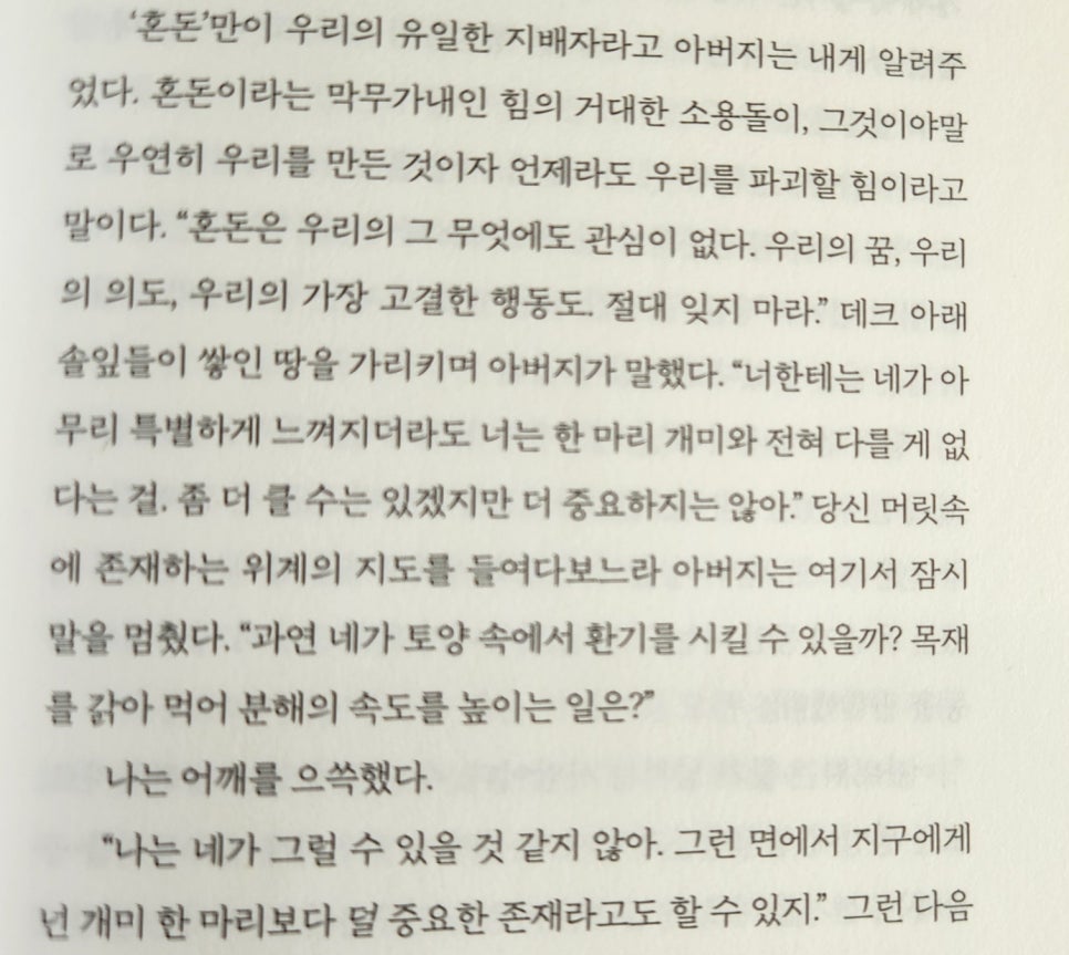 과학자였던 그녀의 아버지는 이렇게 단언합니다. 삶의 의미는 ‘없다’고요. 아버지는 룰루 밀러에게 인간은 우주 속에서 너무나 작고, 개미 한 마리보다 덜 중요한 존재일 수 있다고 말합니다.