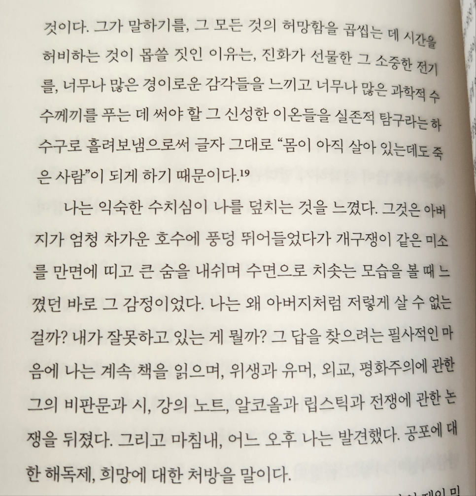 이럴 수가! 저자는 아빠에게서 인생에는 의미가 없다는 말을 듣고, 충격을 받아 해답을 찾고자 조던을 연구했던 것인데. 룰루 밀러는 그 글을 읽고 수치심에 휩싸이게 됩니다. 이 과학자는 인생의 무의미함을 인정하면서까지 불굴의 의지를 지니고 살았는데 왜 나는 그렇게 하지 못할까? 하고 말이죠.
