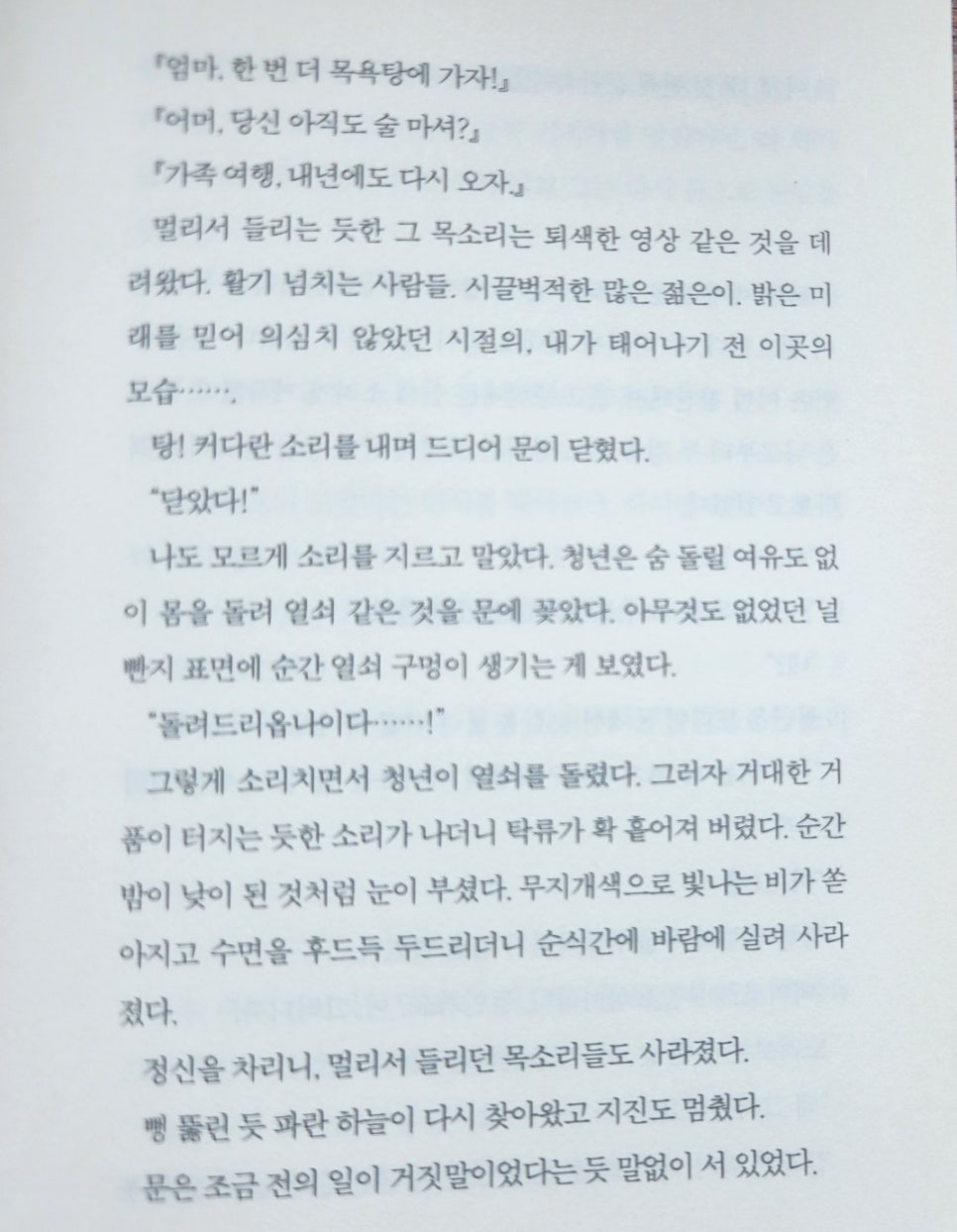 기묘하게도 이 문을 닫을 때는 ‘엄마, 한 번 더 목욕탕에 가자!’, ‘가족여행, 내년에도 다시 오자.’ 같은 왁자지껄하지만 퇴색된 사람 소리가 들립니다.