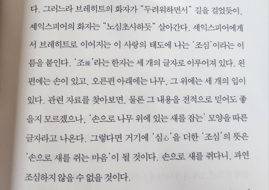 | ‘조操’라는 한자는 세 개의 글자로 이루어져 있다. 1) 왼편에는 손扌이 있고2) 오른편 아래에는 나무 木,3) 그 위에는 세 개의 입口이 있다. 관련 자료를 찾아보면 (…) ‘손으로 나무 위에 있는 새를 잡는’ 모양을 따른 글자라고 나온다. 그렇다면 거기에 ‘심心’을 더한 ‘조심’의 뜻은 ‘손으로 새를 쥐는 마음’이 될 것이다. |