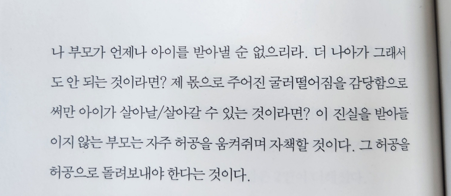 | 부모가 언제나 아이를 받아낼 순 없으리라. 더 나아가 그래서도 안 되는 것이라면? 제 몫으로 주어진 굴러떨어짐을 감당함으로써만 아이가 살아날/살아갈 수 있는 것이라면? 이 진실을 받아들이지 않는 부모는 자주 허공을 움켜쥐며 자책할 것이다. 그 허공을 허공으로 돌려보내야 한다는 것이다. |
