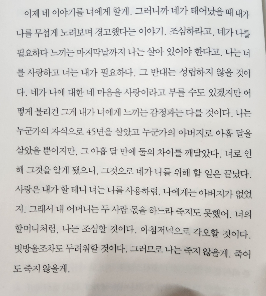 | 이제 네 이야기를 너에게 할게. 그러니까 네가 태어났을 때 내가 나를 무섭게 노려보며 경고했다는 이야기. 조심하라고, 네가 나를 필요하다 느끼는 마지막날까지 나는 살아 있어야 한다고. 나는 너를 사랑하고 너는 내가 필요하다. 그 반대는 성립하지 않을 것이다. 네가 나에 대한 네 마음을 사랑이라고 부를 수도 있겠지만 어떻게 불리건 그게 내가 너에게 느끼는 감정과는 다를 것이다. 나는 누군가의 자식으로 45년을 살았고 누군가의 아버지로 아홉 달을 살았을 뿐이지만, 그 아홉 달 만에 둘의 차이를 깨달았다. 너로 인해 그것을 알게 됐으니, 그것으로 네가 나를 위해 할 일은 끝났다. 사랑은 내가 할 테니 너는 나를 사용하렴. (…)나는 조심할 것이다. 아침저녁으로 각오할 것이다 빗방울조차도 두려워할 것이다. 그러므로 니는 죽지 않을게. 죽어도 죽지않을게. |