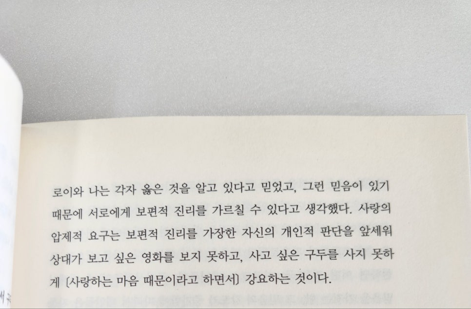 | 클로이와 나는 각자 옳은 것을 알고 있다고 믿었고, 그런 믿음이 있기 때문에 서로에게 보편적 진리를 가르칠 수 있다고 생각했다. 사랑의 압제적 요구는 보편적 진리를 가장한 자신의 개인적 판단을 앞세워 상대가 보고 싶은 영화를 보지 못하고, 사고 싶은 구두를 사지 못하게 (사랑하는 마음 때문이라고 하면서) 강요하는 것이다. |