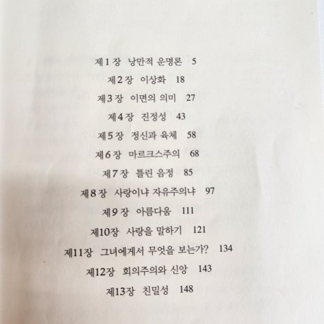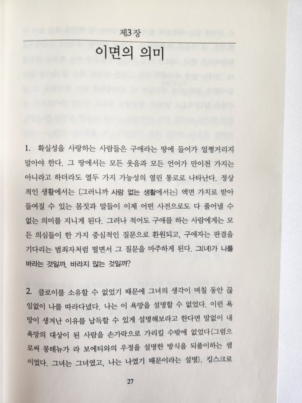 | 확실성을 사랑하는 사람들은 구애라는 땅에 들어가 얼쩡거리지 말아야 한다. 그 땅에서는 모든 웃음과 모든 언어가 만 이천 가지는 아니라고 하더라도 열두 가지 가능성의 열린 통로로 나타난다. 정상적인 생활에서는 (그러니까 사랑 없는 생활에서는) 액면 가치로 받아들여질 수 있는 몸짓과 말들이 이제 어떤 사전으로도 다 풀어낼 수 없는 의미를 지니게 된다.그러나 적어도 구애를 하는 사람에게는 모든 의심들이 한 가지 중심적인 질문으로 환원되고, 구애자는 판결을 기다리는 범죄자처럼 떨면서 그 질문을 마주하게 된다.그(녀)가 나를 바라는 것일까, 바라지 않는 것일까? |