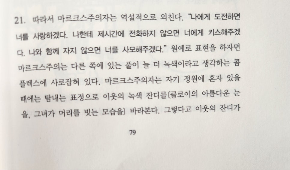 마르크스는 가입하고 싶은 클럽의 회원권을 받는 순간, 그 클럽에 그렇게 들어가고 싶지 않아집니다. 나 역시 이와 비슷하게 클로이가 나를 사랑하기를 바랐으면서, 막상 그녀가 나를 사랑하자 그녀에게 화를 내는 것입니다.
