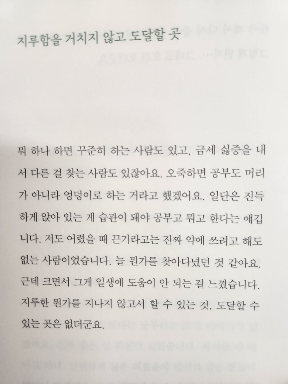 | 뭐 하나 하면 꾸준히 하는 사람도 있고, 금세 싫증을 내서 다른 걸 찾는 사람도 있잖아요. 오죽하면 공부도 머리가 아니라 엉덩이로 하는 거라고 했겠어요. 일단은 진득하게 앉아 있는 게 습관이 돼야 공부고 뭐고 한다는 얘깁니다. 저도 어렸을 때 끈기라고는 진짜 약에 쓰려고 해도 없는 사람이었습니다. 늘 뭔가를 찾아다녔던 것 같아요. 근데 크면서 그게 일생에 도움이 안 되는 걸 느꼈습니다. 지루한 뭔가를 지나지 않고서 할 수 있는 것, 도달할 수 있는 곳은 없더군요. |