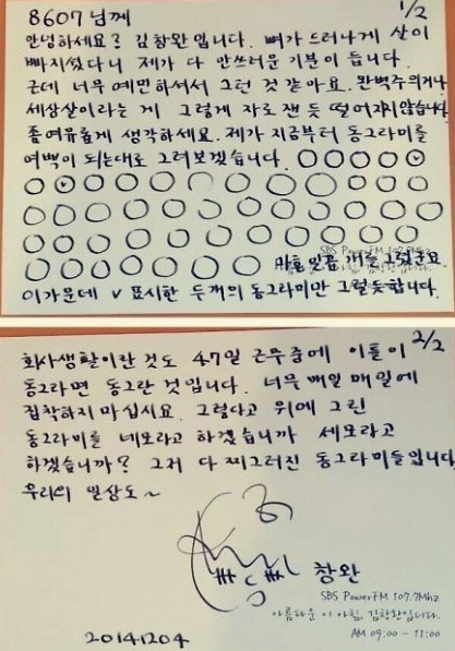 어느 날 김창완 선생님께서 진행하신 라디오에 직장 생활 스트레스로 살이 빠졌다는 사연이 왔습니다. 김창완 선생님께서는 그 편지 사연을 본 후 종이 여백에 47개의 작은 원을 그리십니다.