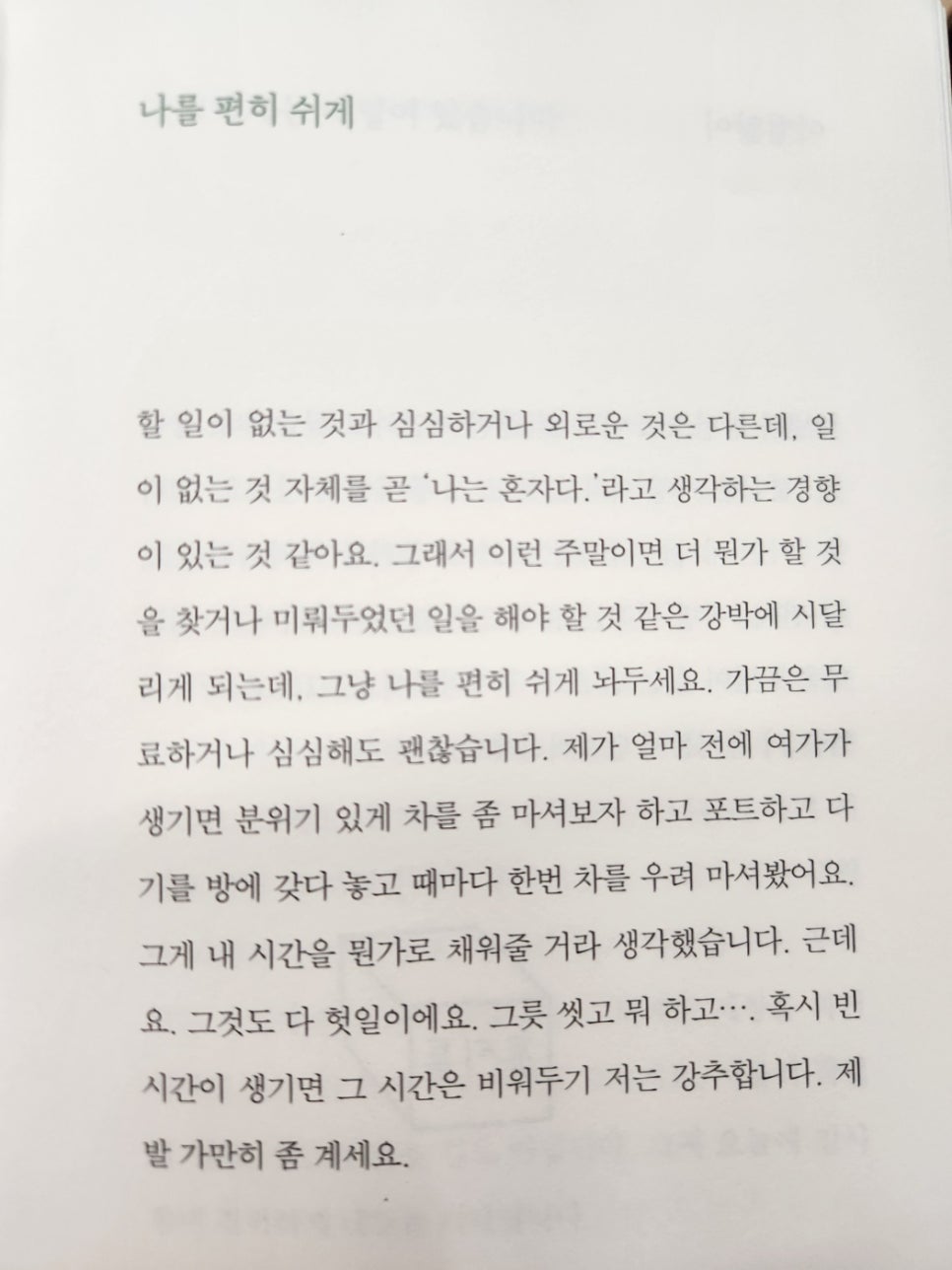 | 할 일이 없는 것과 심심하거나 외로운 것은 다른데, 일이 없는 것 자체를 곧 ‘나는 혼자다.’라고 생각하는 경향이 있는 것 같아요. 그래서 이런 주말이면 더 뭔가 할 것을 찾거나 미뤄두었던 일을 해야 할 것 같은 강박에 시달리게 되는데, 그냥 나를 편히 쉬게 놔두세요. 가끔은 무료하거나 심심해도 괜찮습니다. 제가 얼마 전에 여가가 생기면 분위기 있게 차를 좀 마셔보자 하고 포트하고 다기를 방에 갖다 놓고 때마다 한번 차를 우려 마셔봤어요. 그게 내 시간을 뭔가로 채워줄 거라 생각했습니다. 근데요. 그것도 다 헛일이에요. 그릇 씻고 뭐 하고…. 혹시 빈 시간이 생기면 그 시간은 비워두기 저는 강추합니다. 제발 가만히 좀 계세요. |